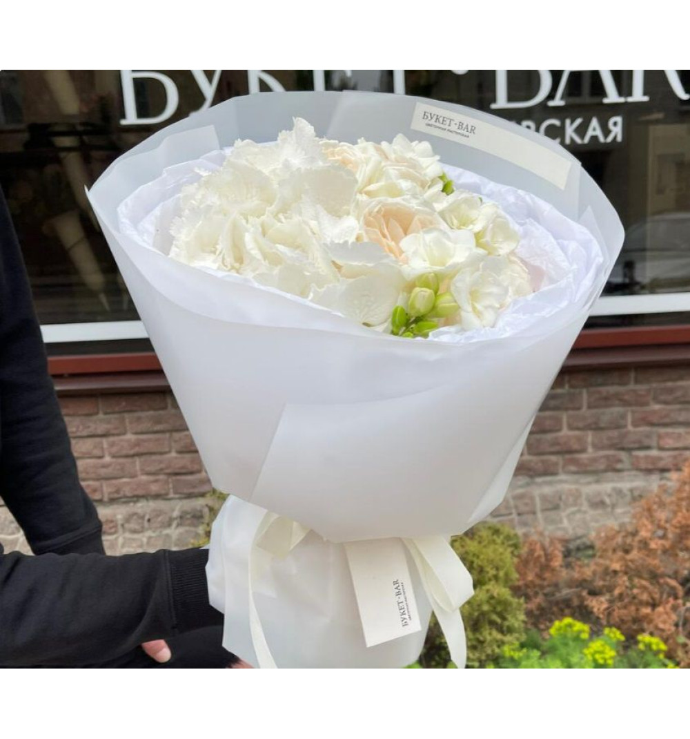 Бұл букет молшылық пен амандықты білдіретін 1 нәзік ақ гортензияны және нәзіктік пен әсемдік қосатын 3 ақ фрезияны тамаша біріктіреді. 5 ақ О'Хара раушан гүл шоғына сән-салтанат пен романтика ноталарын әкеледі. Букет грогрен таспамен, дизайнерлік қаптамамен, сондай-ақ фирмалық белгімен және стикермен безендірілген, бұл оны ерекше және керемет сыйлыққа айналдырады. Ұмытылмас тәжірибе жасау және арнайы алушы үшін ерекше сәтті ерекшелеу үшін осы қолтаңба гүл шоғын беріңіз.