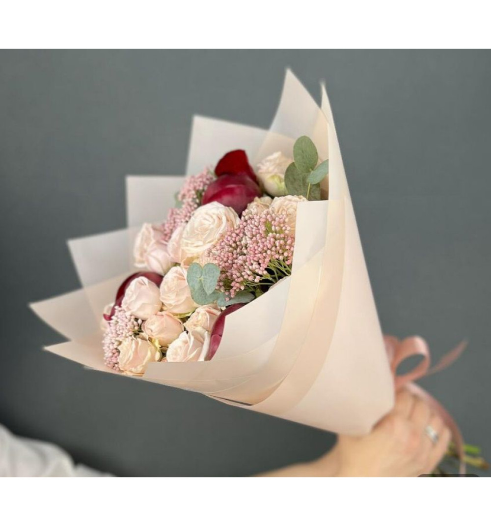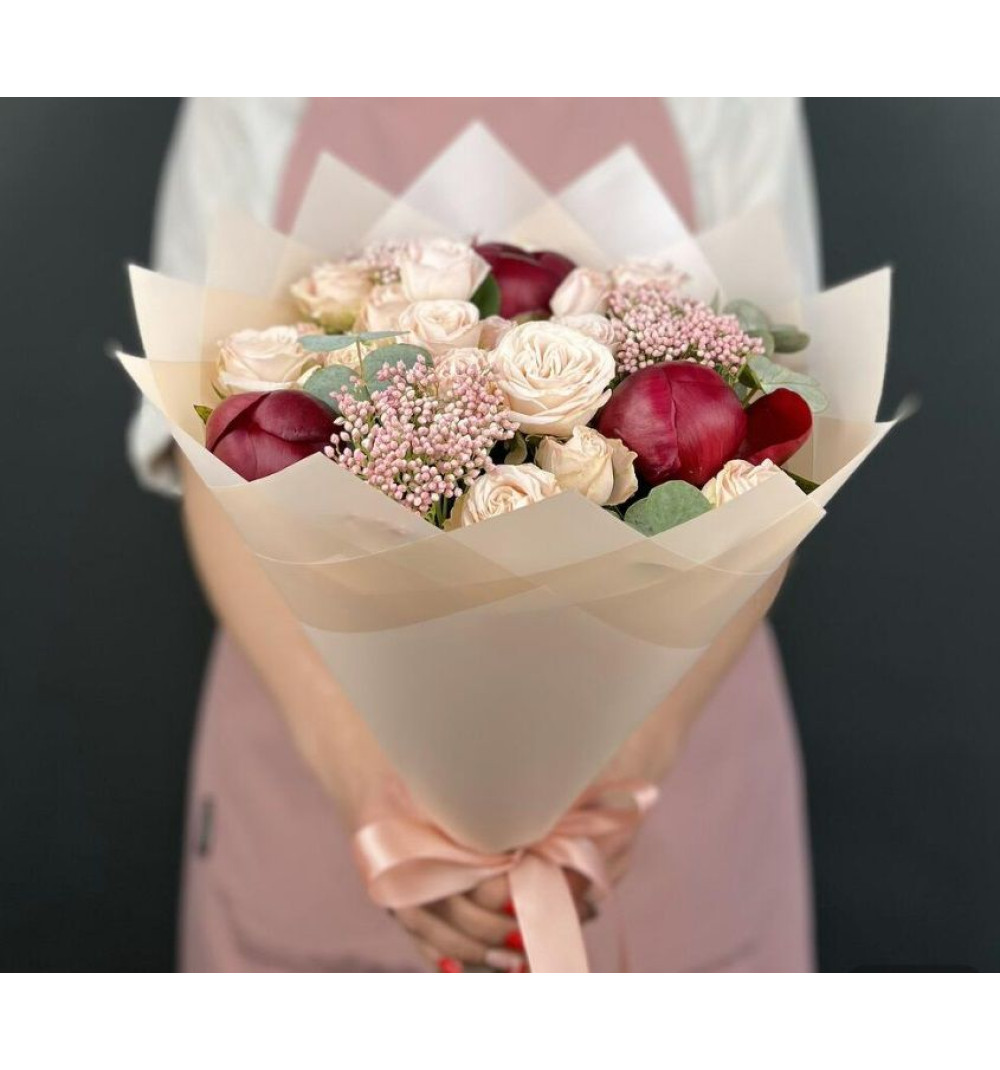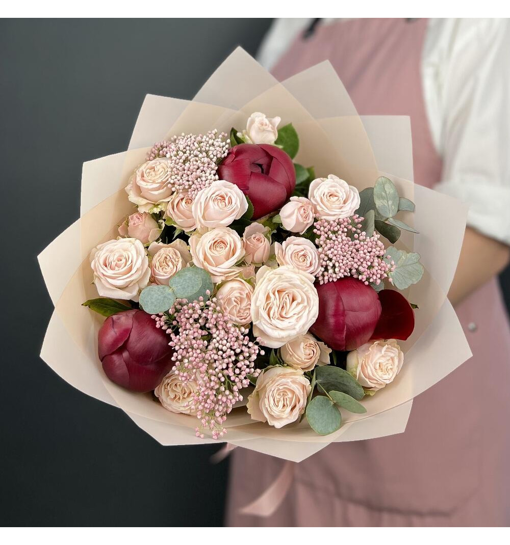Купить Авторский букет из красных Пионов и кремовых кустовых Роз с Озотамнусом в Усть-Каменогорске за 20 000 ₸ | интернет-магазин «Guls»