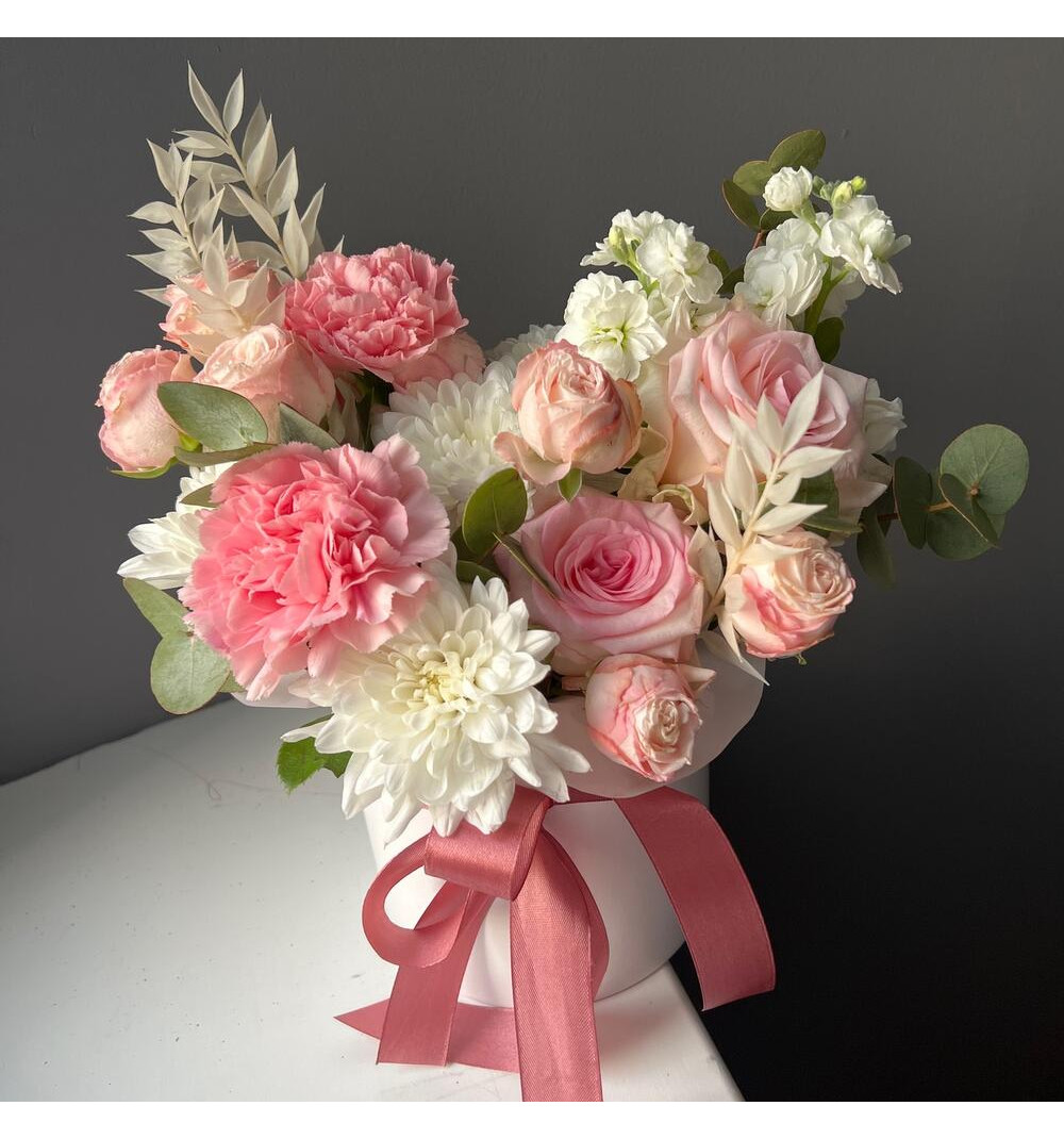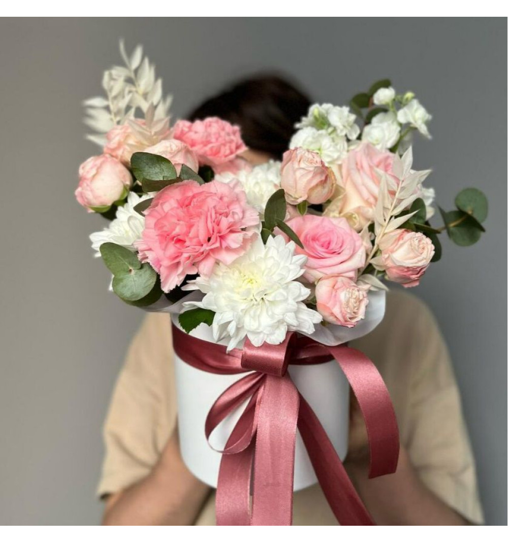 Купить Кустовые пионовидные розы, маттиола и хризантема в шляпной коробочке в Усть-Каменогорске за 15 000 ₸ | интернет-магазин «Guls»