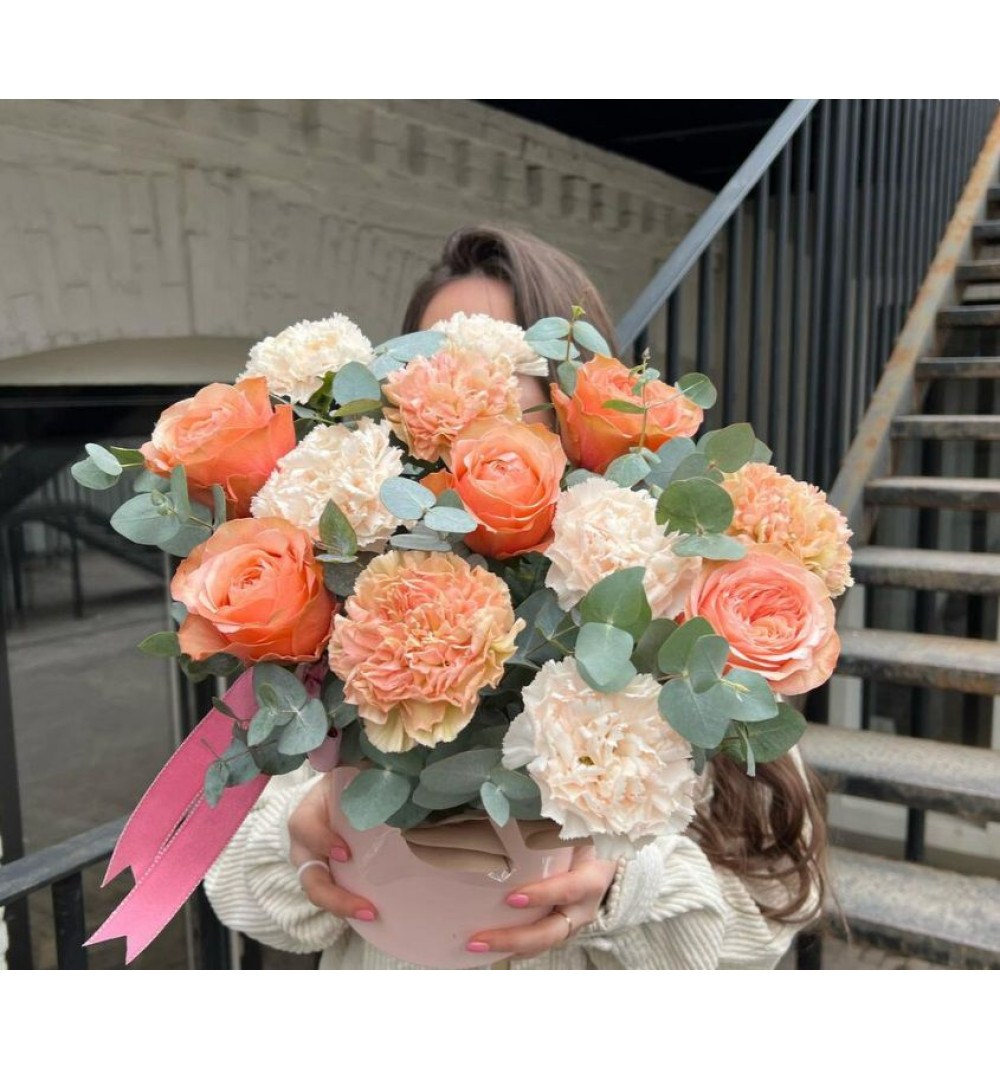 Композиция "Медовый" - это утонченное сочетание свежих эвкалиптовых веточек, нежных диантусов, и изысканных роз пионовидной формы кахала. Каждый элемент букета тщательно подобран, чтобы создать гармоничное и восхитительное впечатление. Коробка в стиле шляпной придает композиции особую изысканность и позволяет с легкостью подарить эту красоту своим близким и любимым. Букет "Медовый" - прекрасный выбор для создания атмосферы тепла и нежности в особенные моменты жизни.