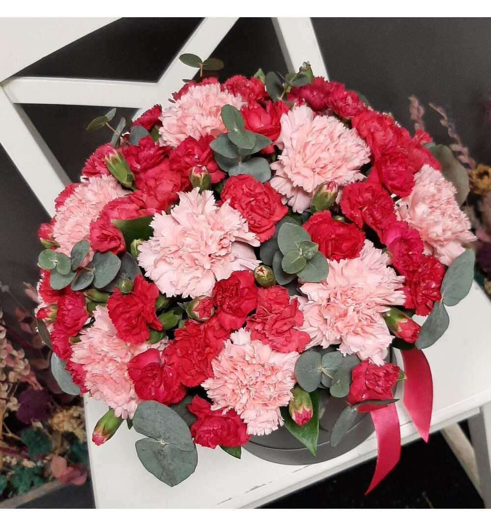 Яркая кустовая и нежно коралловая гвоздика в шляпной коробке